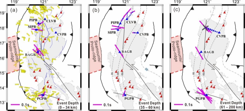 Cao, L., He, X., Zhao, L., Huang, B.‐S., Hao, T., Zhao, M., et al. (2025). Frequency‐dependent anisotropy and upper plate deformation due to seamount subduction in northern Luzon. Geophysical Research Letters, 52, e2025GL119325.