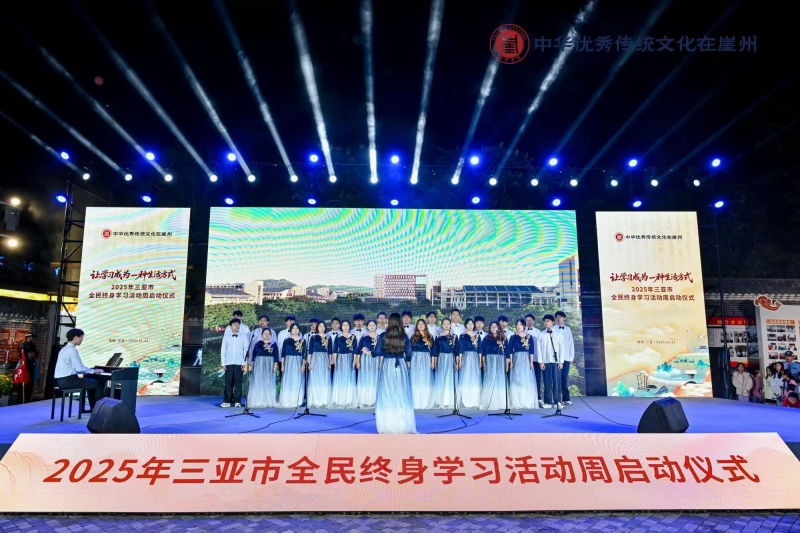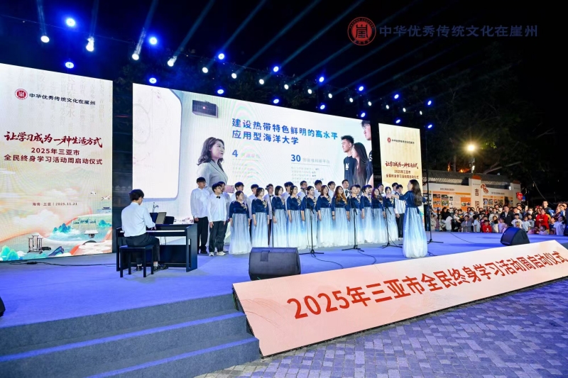 11月21日晚,三亚市崖州区崖州古城中心广场华灯初上、人声鼎沸,2025年三亚全民终身学习活动周启动仪式在此正式拉开帷幕。海南热带海洋学院崖州湾创新研究院(以下简称创新院)研究生合唱团受邀参演,以一首经典合唱《五月的鲜花》惊艳登场,用嘹亮歌声传递青春正能量,展现了新时代研究生的精神风貌,更彰显了创新院深度融入地方、服务三亚建设的责任担当。