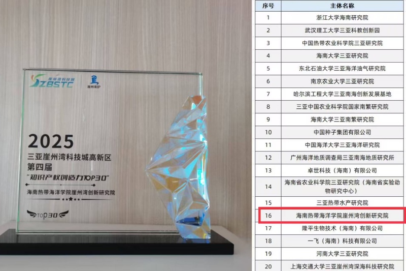 喜报丨海南热带海洋学院崖州湾创新研究院再获“知识产权创造力TOP30”奖项