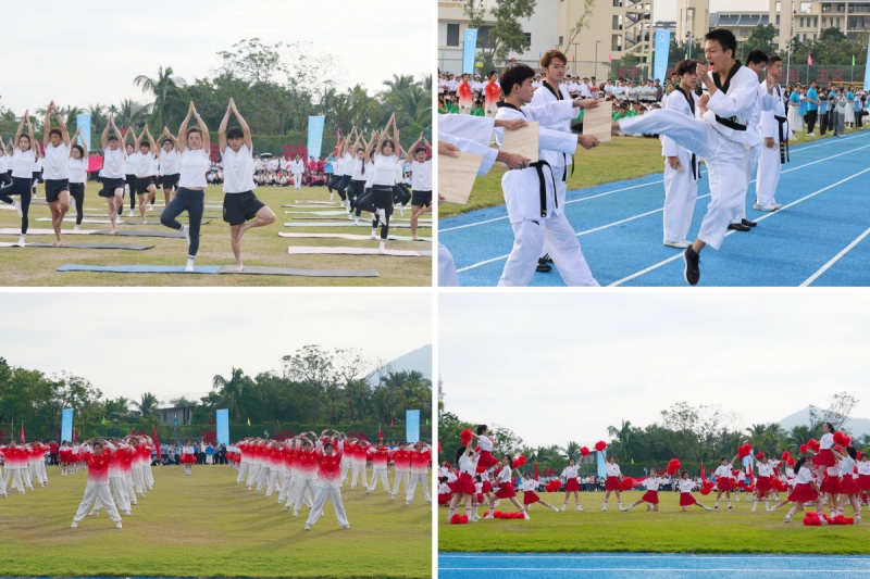 开幕式特别设置了体育成果展示环节,赢得了现场师生的阵阵掌声。龙狮表演在锣鼓喧天中率先登场,金龙翻腾、雄狮腾跃,展现了力与美的完美融合。健身瑜伽表演行云流水,以优雅流畅的动作诠释了身心合一的和谐之美;跆拳道表演刚劲有力、虎虎生威,展现了青春的爆发力与拼搏精神;健身气功八段锦动作柔中带刚,体现了中国传统养生文化的深厚底蕴;最后,活力四射的啦啦操表演以动感的节奏和富有创意的队形变化,再次点燃全场热情。整场展演节目编排新颖、节奏明快,充分展现了我校体育教学的丰硕成果和学子们的青春风采。