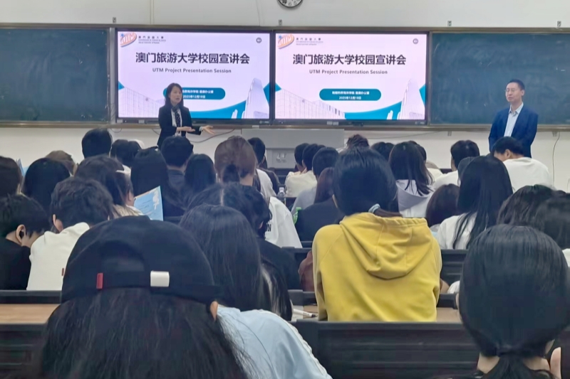 会后,林宝玉与该校副教授周勇在校园宣讲会上详细介绍了澳门旅游大学的办学特色、教学环境、交流项目与学位课程设置等,现场交流气氛热烈。