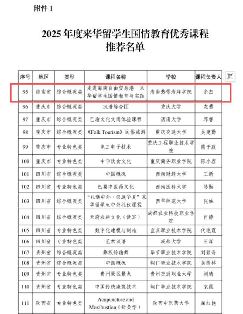 近日,中国教育国际交流协会正式公布“2025年度来华留学生国情教育优秀课程和中外青少年社会实践活动基地”推荐名单。全国共121门课程、124个基地成功入选。我校申报的《走进海南自由贸易港——来华留学生国情教育与实践》课程入选来华留学生国情教育优秀课程(综合概括类),南海文化博物馆入选中外青少年社会实践活动基地。此次双项入选,实现了我校在国家级来华留学生国情教育精品课程认定上“零的突破”。