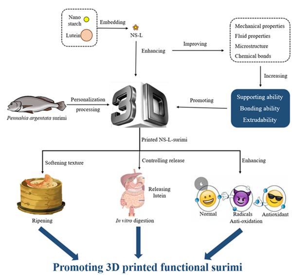 该团队成员首先以白姑鱼鱼糜和淀粉为原料,通过不同温度对于鱼糜材料特性的影响,尝试了温度在鱼糜材料打印过程中的可行性,从而确定了常温对于鱼糜打印产品的普适性。此外,还分析了可打印性相关因素——质构、凝胶强度、流变特性的相关性,并建立了表征材料可打印性的印刷适性方程,用来快速判断食品材料可打印性的优劣。其次,通过工艺优化筛选,制备出纳米淀粉——低聚木糖/叶黄素颗粒。对3D可打印性效果影响测定发现,小颗粒的纳米淀粉功能颗粒可以更好的嵌入鱼糜蛋白凝胶孔隙中,增加凝胶强度,质构特性和机械强度,从而提升打印效果。功能成分释放率和功能测定结果表明,纳米颗粒的包埋延长了功能成分的释放时间,达到了可持续释放的效果,同时它使3D打印鱼糜表现出较好的抗氧化性和抑菌性。此外,低聚木糖/叶黄素的加入还可以延长物料的储存时间,提高打印利用率。