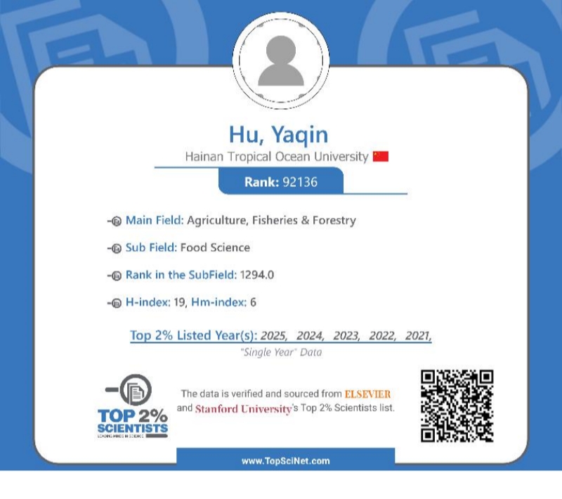 近日,美国斯坦福大学与爱思唯尔数据库(Elsevier Data Repository)正式发布《全球前2%顶尖科学家榜单2025》。我校食品科学与工程学院胡亚芹教授再次荣誉入选,这已是她自2021年起连续第五年跻身这一权威榜单,彰显了其在国际食品科学领域的持续影响力与卓越贡献。