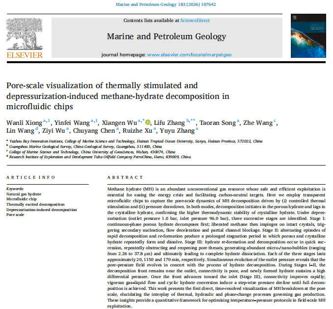 近日,我院海洋科学专业22级本科生熊婉利同学及小组成员张彧淯、吴子逸、陈楚洋和许睿哲同学在国际期刊Marineand Petroleum Geology(中国科学院二区)上发表题为Pore-scale visualization of thermally stimulated and depressurization-induced methane-hydrate decomposition in microfluidic chips的研究论文。该成果标志着我校本科生科研能力达到国际高水平,为海洋科学领域人才培养写下亮眼注脚。