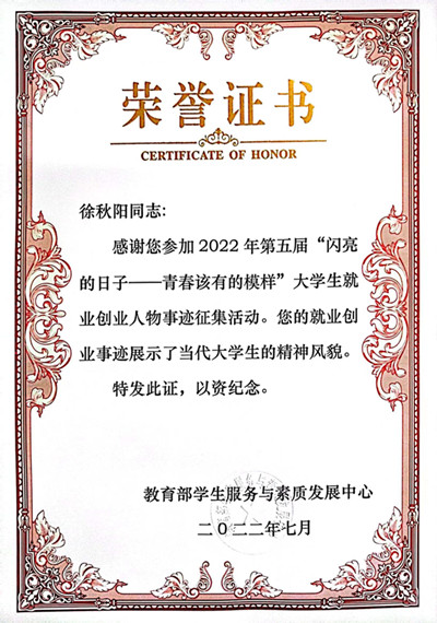 我校2019届毕业生徐秋阳入选教育部2022年第五届“闪亮的日子——青春该有的模样”大学生就业创业典型事迹人物。“闪亮的日子——青春该有的模样”大学生就业创业典型选树推广了高校大学生扎根基层、创新创业、建功军营的优秀事迹,旨在充分发挥典型示范引领和朋辈教育作用,帮助青年学生树立科学正确的择业观、就业观、职业观。