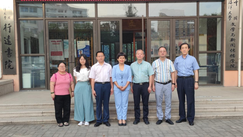 为促进学科建设,推动硕士点学位授权点申报,我校人文社会科学学院于6月16日前往中国海洋大学文学与新闻传播学院进行交流调研,我校人文社会科学学院党委书记郑力乔、副院长杨超,中国海洋大学文学与新闻传播学院党委书记刘健、副院长赵成国参加调研,副院长、教授韦春喜主持。
