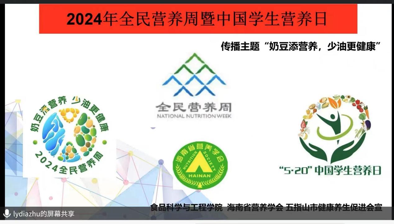 5月20日,我校食品科学与工程学院联合海南省营养学会和五指山市健康养生促进会,共同主办了“2024年全民营养周暨中国学生营养日”活动。本次活动通过腾讯会议线上开展,食品科学与工程学院2021、2022、2023级本科生参加活动。