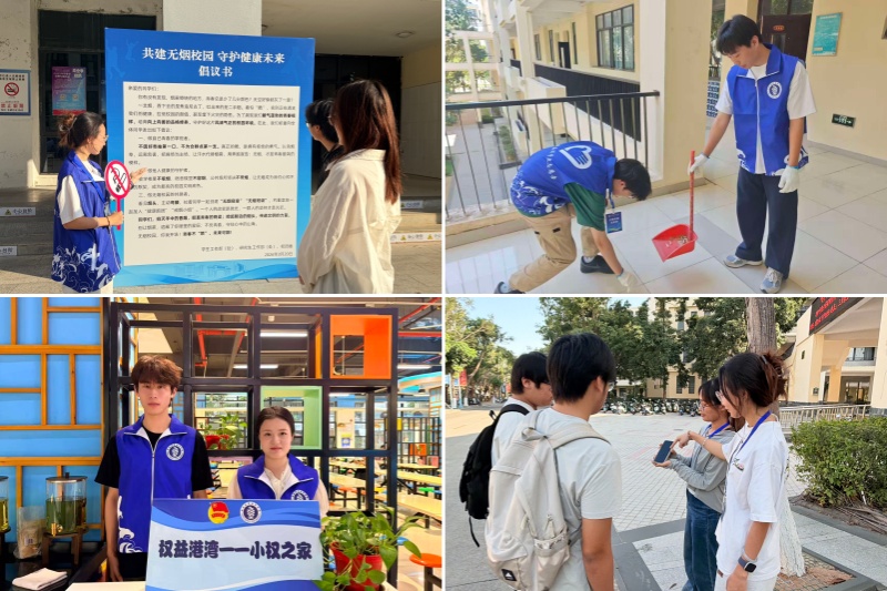 为深入推进无烟校园创建工作,营造健康、洁净、文明的育人环境,校团委组织全校各级学生干部,持续开展控烟劝导、烟头清理及控烟宣传等专项工作,以常态化文明督导为抓手,发挥学生干部的示范引领作用。