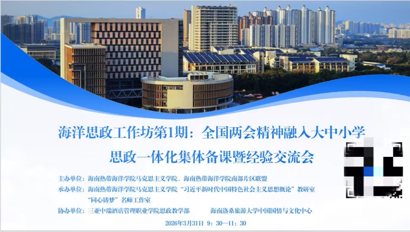 为深入推进以“习近平新时代中国特色社会主义思想概论”为核心的思政课课程群建设,及时将重大主题、重大事件转化为育人资源,有形、有感、有效地推进大中小学思政课一体化建设,3月31日上午,由海南省大中小学思政课一体化建设海南热带海洋学院区域联盟和海南热带海洋学院马克思主义学院联合主办,海南热带海洋学院马克思主义学院“习近平新时代中国特色社会主义思想概论”教研室和“同心铸梦”名师工作室联合承办、三亚中瑞酒店管理职业学院思政教学部和海南洛桑旅游大学中国国情与文化中心协办的“全国两会精神融入大中小学思政课一体化集体备课暨经验交流会”在三亚召开。