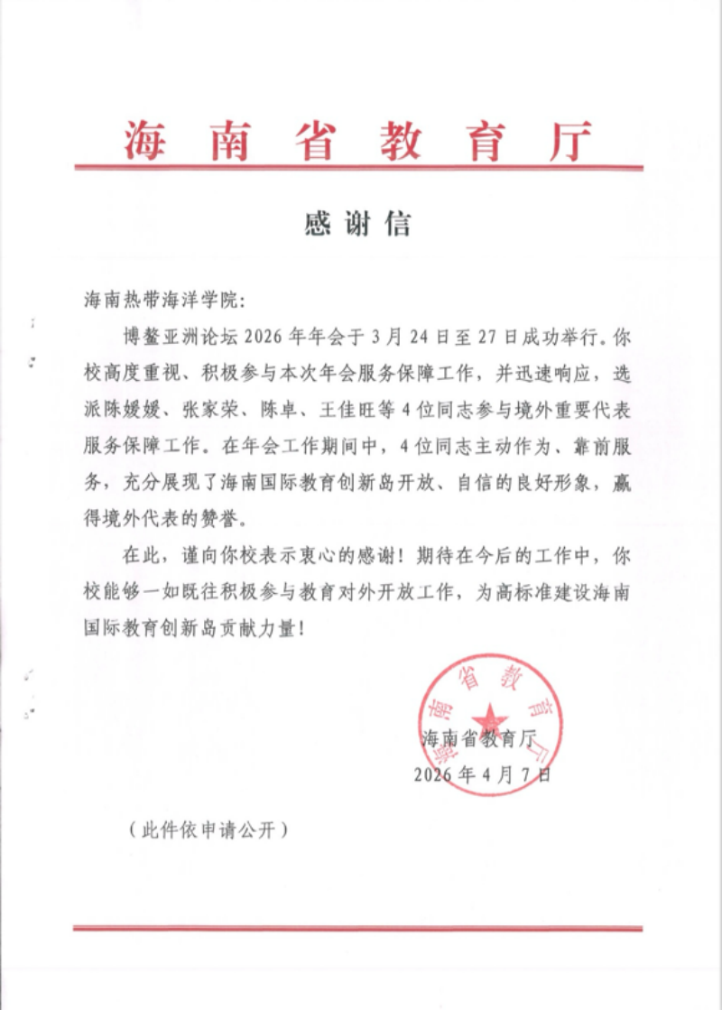 近日,我校收到海南省教育厅发来的感谢信,对学校积极参与博鳌亚洲论坛2026年年会服务保障工作、圆满完成各项任务给予充分肯定,并致以衷心感谢。