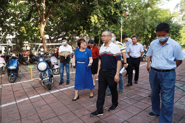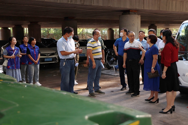 贾文涛一行实地查看了我校各类垃圾分类投放点安置及使用情况,并听取了学校相关负责人详细介绍学校及校园周边垃圾分类工作情况。