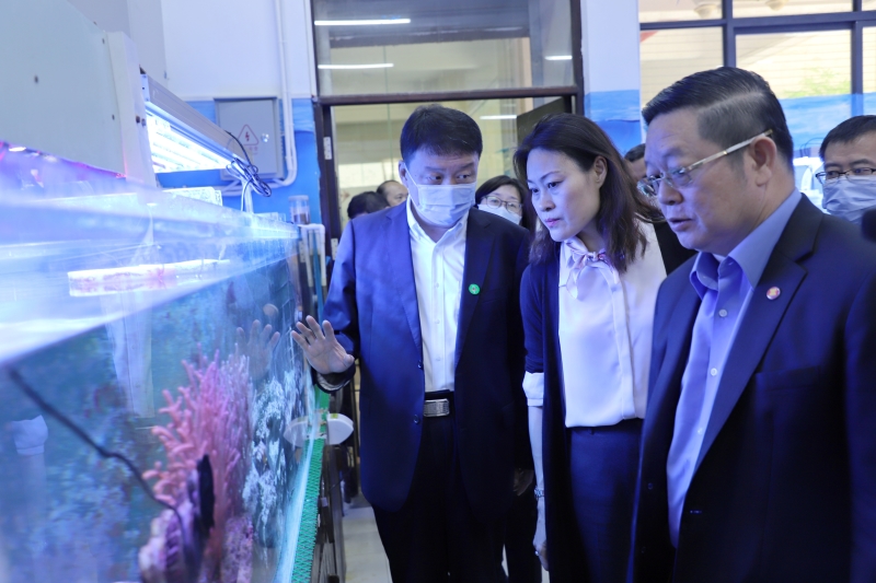 代表团一行参观了我校珊瑚实验室和热带海洋生物资源利用与保护教育部重点实验室。我校珊瑚实验室负责人王沛政、马来西亚籍外教陈耀贤、水产与生命学院办公室主任杨宁,分别向代表团介绍珊瑚生态修复研究室团队研究方向、目前的研究进展,以及海南热带陆海生物资源保护和利用的对策建议、教育部重点实验室团队建设和科研情况等。代表团一行对此非常感兴趣,并与工作人员展开交流。