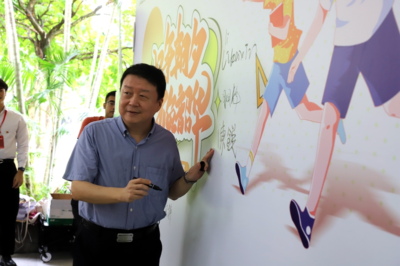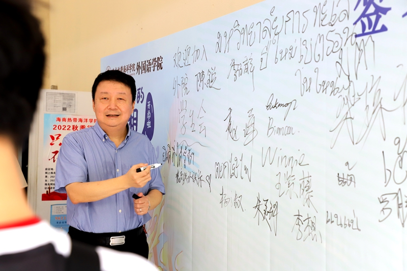 今年学校迎新,多个二级学院都设置了签名留言墙。第一天校领导到迎新现场指导工作时,陈锐书记被邀请签名留言。他接过签字笔,突然对拍照的人员说:“来,我给你们摆个pose吧,你们好拍一些。”书记幽默的一句话语,轻松的一个举动,瞬间逗笑了在场所有工作人员和正在办理报到手续的新生,一下子拉近了大家的距离,温暖了大家的心。
