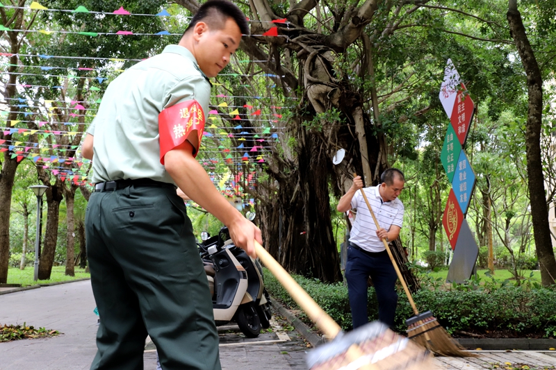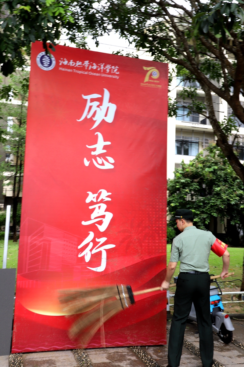 台风过境第二天,学校便按原计划开展迎新工作。但是昨晚台风对校园破坏严重,树木倒伏,树叶残枝满地。为了尽快恢复校园秩序,确保迎新工作顺利开展,学校后勤职工、大学生志愿者一大清早就出来参与清理工作。我作为宣传工作人员赶到现场拍照,准备记录大家辛勤劳作的身影,突然看见几位身穿军装的退伍军人学生正在清扫道路,其中一位拿着扫把细心地拭擦校训展板上因台风遗留下的淤泥残渣。我不由感叹:这就是军人的优良品质,不畏困难冲锋在前,“战地”细节见真情,让人肃然起敬和感动,我们为有这样的学生而自豪。