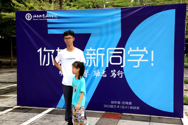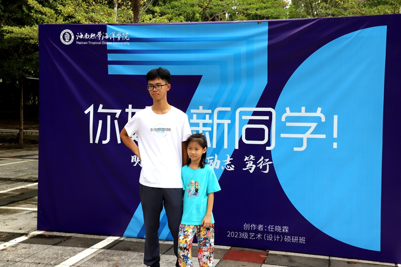 我在迎新现场拍照,路过印有“你好,新同学”的打卡墙时,看见一家人一起送哥哥来校报到。妈妈提议哥哥在打卡墙前拍照留念,转念又要求妹妹也和哥哥站在一起拍。妹妹扭扭捏捏的,很害羞,不想拍。妈妈喊:“快点去,以后你也要像哥哥一样考上大学!”我听着瞬间感动,好一位就地取材言传身教的妈妈啊,于是我快速拿起相机抓拍下这张照片。这应该算是大学校园文化传承的力量了。