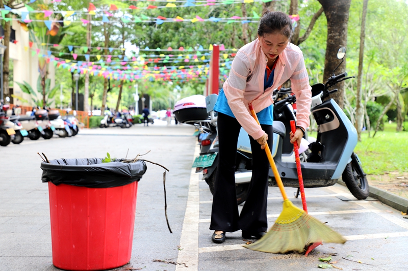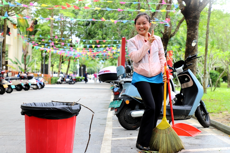 为了全面记录学校灾后重建的画面,我在校园里来回穿梭,分别跑到各个区域拍照。经过三栋教学楼时,我看见一位清洁工在清扫校道,便悄悄地上前帮她拍照,不料被她发现了。她笑着说:“一定要打开美颜哟,要拍得美美的。”还自发比耶拍照姿势让我拍。如此开心乐观的人,哪怕清洁工作再苦再累,也要有好心情。正是她(他)们这种乐观向上的精神,才让我们热海院变得越来越美丽,越来越温情。我想,她应该是热海院最美清洁工。我们要为她点赞!