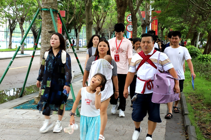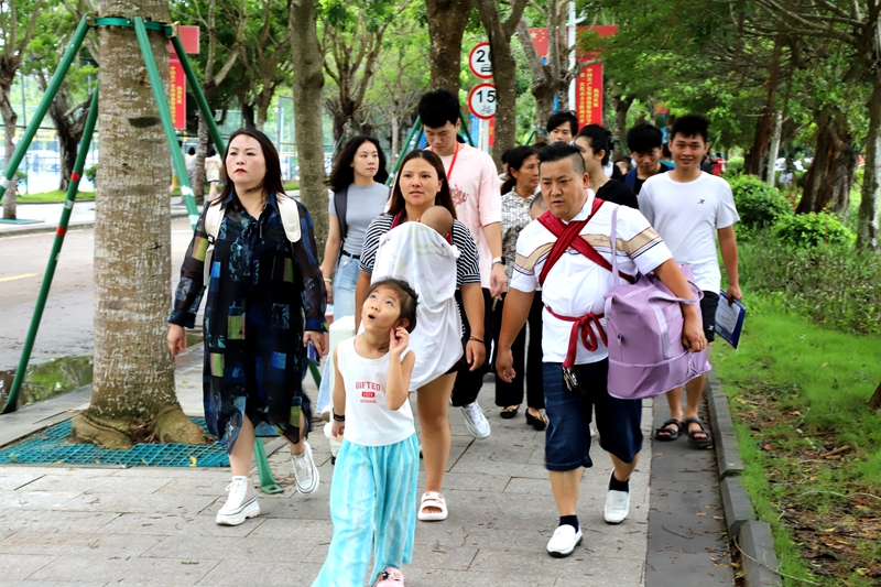 下面这张是经过湖边抓拍的。每年新生报到,都有小家伙陪同报到,今天这家可能是最小年纪了,还在妈妈背包里睡觉,嗷嗷待乳呢。还有这位小姐姐着实可爱,她看着很多树木都用铁架加固,有点害怕,不时抬头看树会不会倒下来压到她。这样的画面尽显这家人的幸福。学校每年迎新都为家长开放空调休息室,提供矿泉水和电瓶车接送等温馨服务,得到家长们的好评。祝愿2024级的小海带们在热海院大家庭学习生活一定要狠狠地幸福。