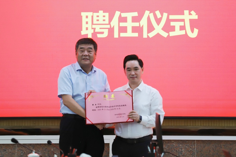 座谈会上,吕治国为曹兵颁发海南热带海洋学院客座教授聘书,开启双方人才共享与深度合作的新篇章。