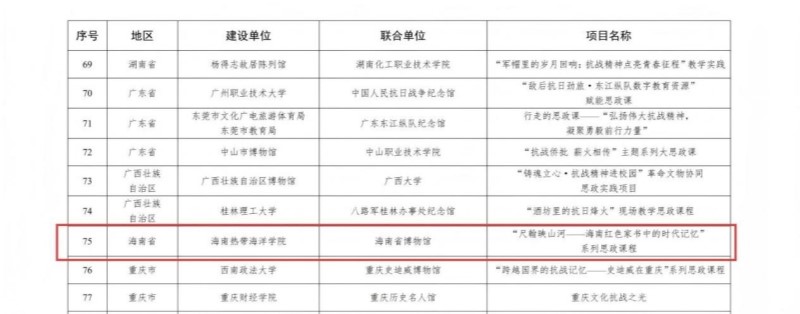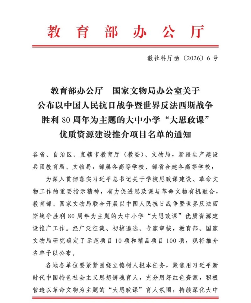 近日,教育部、国家文物局联合公布了以中国人民抗日战争暨世界反法西斯战争胜利80周年为主题的大中小学“大思政课”优质资源建设推介项目名单。我校作为报送单位,联合海南省博物馆申报的“尺翰映山河——海南红色家书中的时代记忆”项目,成功入选全国100项推介精品项目。